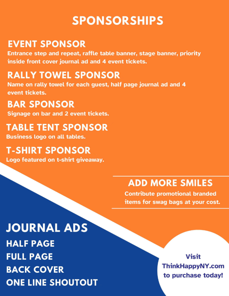 5th Annual Night For Smiles Please fill out the form below Night For Smiles Tickets Name* First Last Phone*Email* One (1) Ticket Quantity Price: $175.00 Quantity Sponsor a Think Happy Kid to attend the event Quantity Price: $75.00 Quantity Team of 10 Quantity Price: $1,750.00 Quantity Event Sponsor Quantity Price: $5,000.00 Quantity Entrance step and repeat, raffle table banner, stage banner, priority inside front cover journal ad and 4 event tickets.Rally Towel Sponsor Quantity Price: $2,500.00 Quantity Name on rally towel for each guest, half page journal ad and 4 event tickets.Bar Sponsor Quantity Price: $1,000.00 Quantity Signage on bar and 2 event tickets.Table Tent Sponsor Quantity Price: $750.00 Quantity Business logo on all tables.T-Shirt Sponsor Quantity Price: $500.00 Quantity Logo featured on t-shirt giveaway.Journal Ads:Half Page Quantity Price: $250.00 Quantity Full Page Quantity Price: $350.00 Quantity Back Cover Quantity Price: $500.00 Quantity One Line Shoutout Quantity Price: $100.00 Quantity Name of Attendees (Press the "+" button to add more attendees) Total $0.00 Credit Card American ExpressDiscoverMasterCardVisaSupported Credit Cards: American Express, Discover, MasterCard, Visa Card Number Month010203040506070809101112 Year20252026202720282029203020312032203320342035203620372038203920402041204220432044 Expiration Date Security Code Cardholder Name